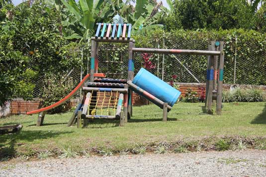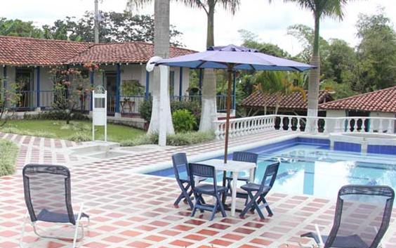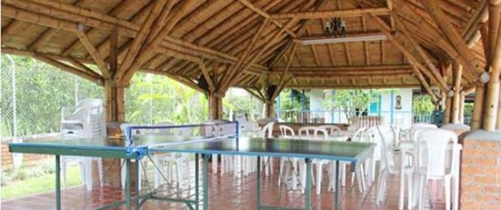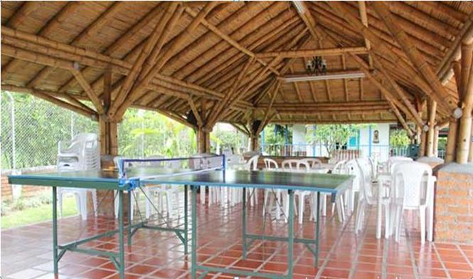 Arquitectura moderna con toques tradicionales de una planta, corredores que lo rodean, amplias zonas verdes. Piscina, cancha de microfútbol, vestier, cancha de baloncesto. Su decoración es sencilla con buen gusto